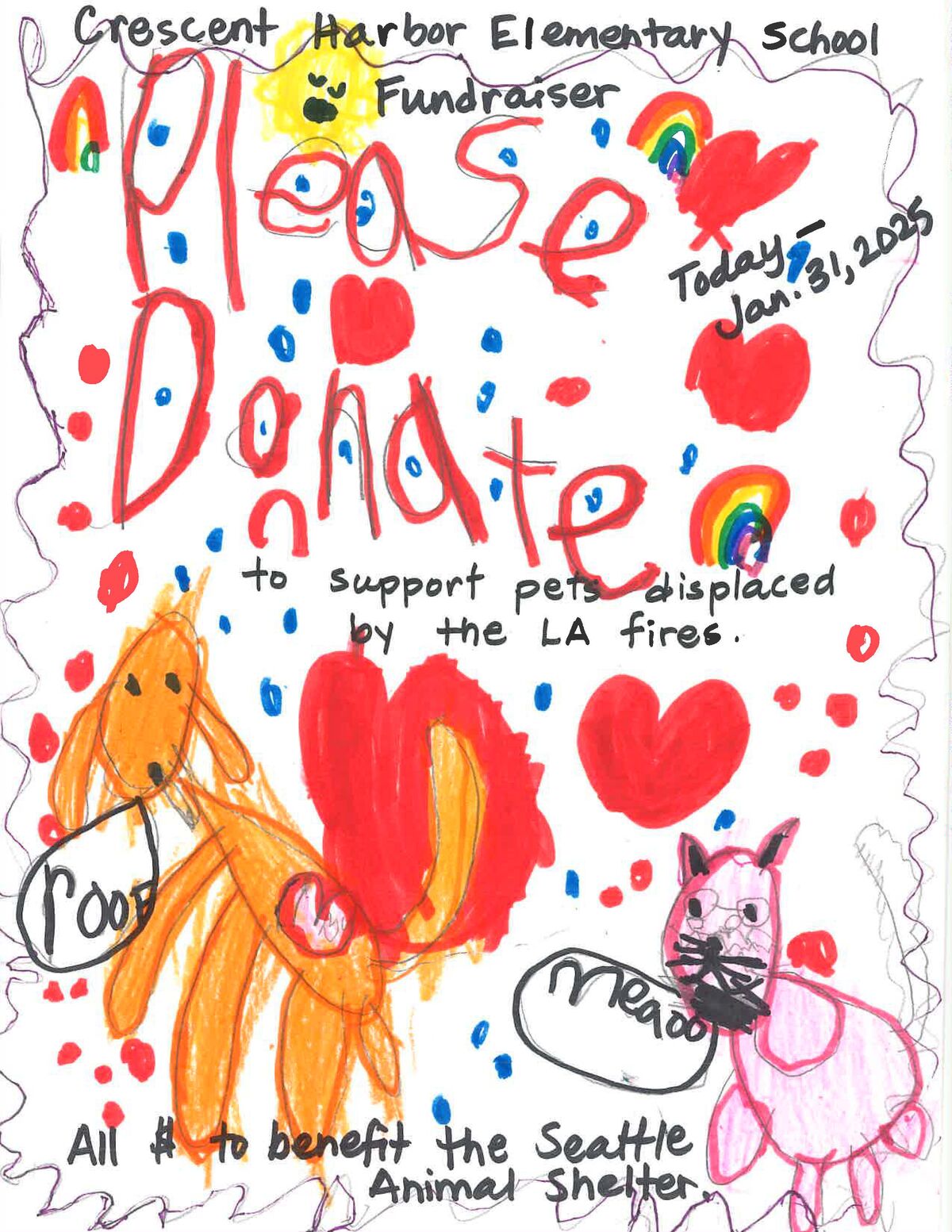 The first grade students in Room 133 are leading a school-wide fundraiser to collect money to benefit pets and other animals that have been impacted by the tragic fires in Los Angeles, California. We hope you will consider a small donation to benefit the Seattle Animal Shelter that is fostering many of the displaced pets.